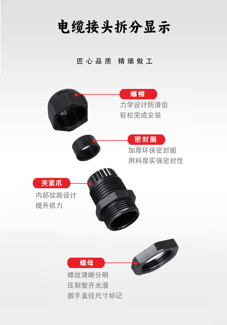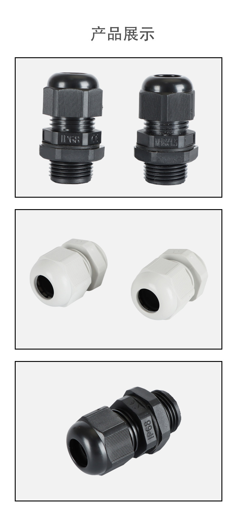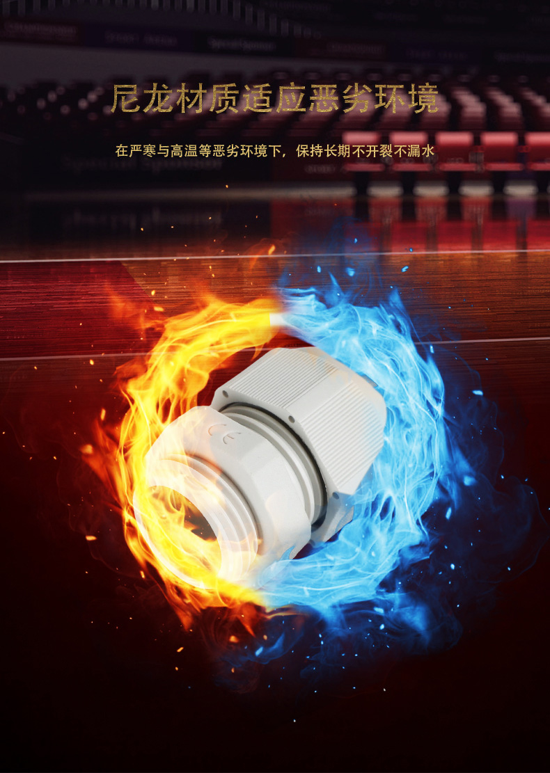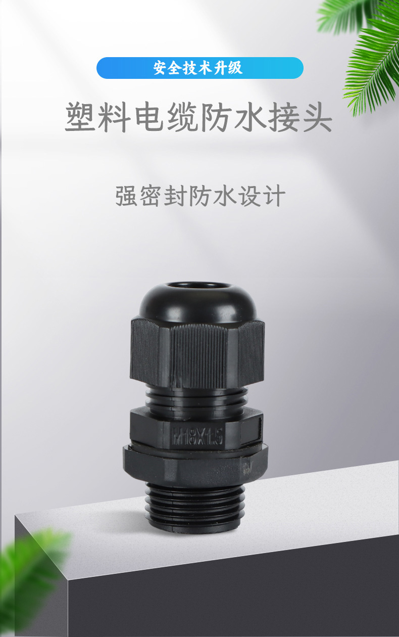 尼龍材質(zhì)適用惡劣環(huán)境紅、灰、黑、深灰、白、藍(lán) 六種顏色常規(guī):黑、灰兩種顏色,其它顏色需要定做在嚴(yán)寒與高溫等惡劣環(huán)境下,保持長(zhǎng)期不開裂不漏水高密封性防水接頭保護(hù)電纜安全,長(zhǎng)期使用不容易滲水