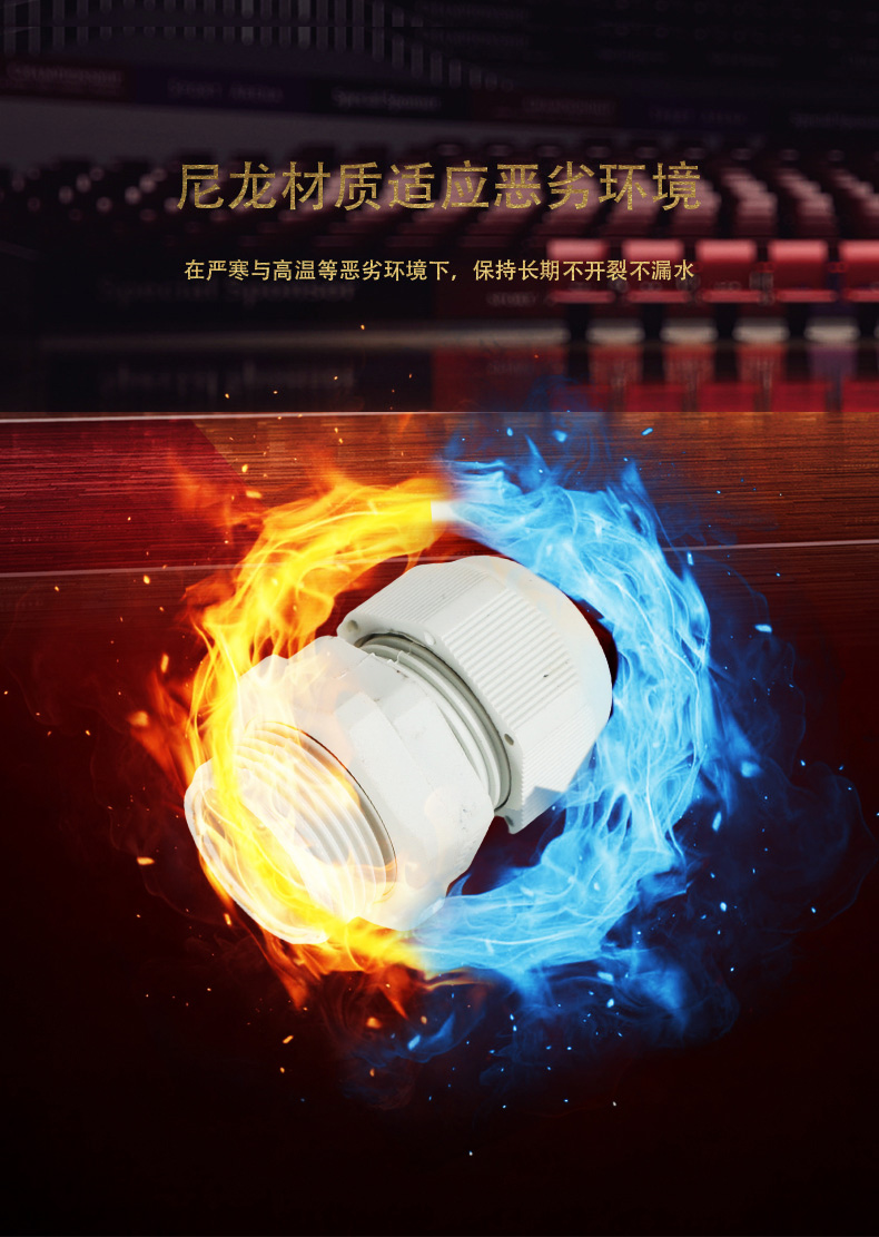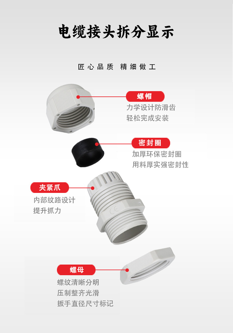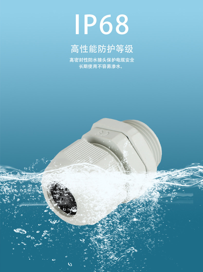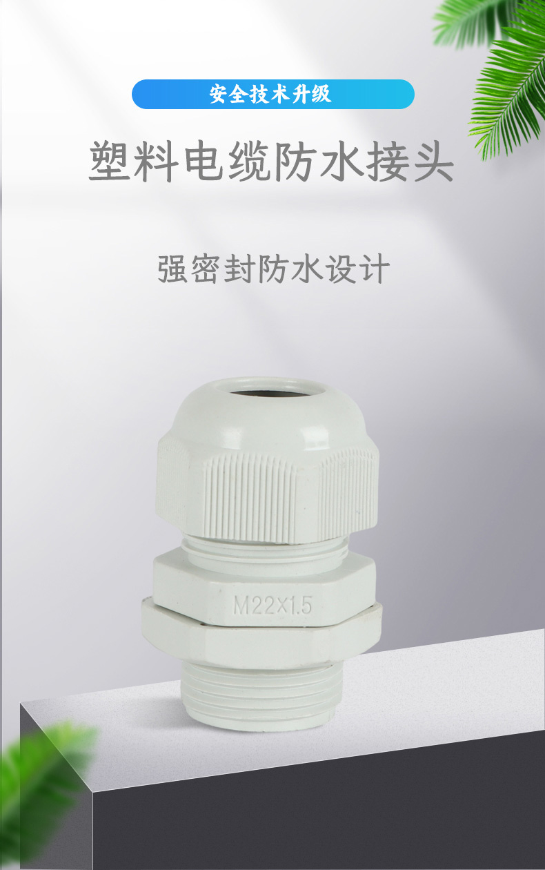 尼龍材質(zhì)適用惡劣環(huán)境紅、灰、黑、深灰、白、藍(lán) 六種顏色常規(guī):黑、灰兩種顏色,其它顏色需要定做在嚴(yán)寒與高溫等惡劣環(huán)境下,保持長(zhǎng)期不開裂不漏水高密封性防水接頭保護(hù)電纜安全,長(zhǎng)期使用不容易滲水