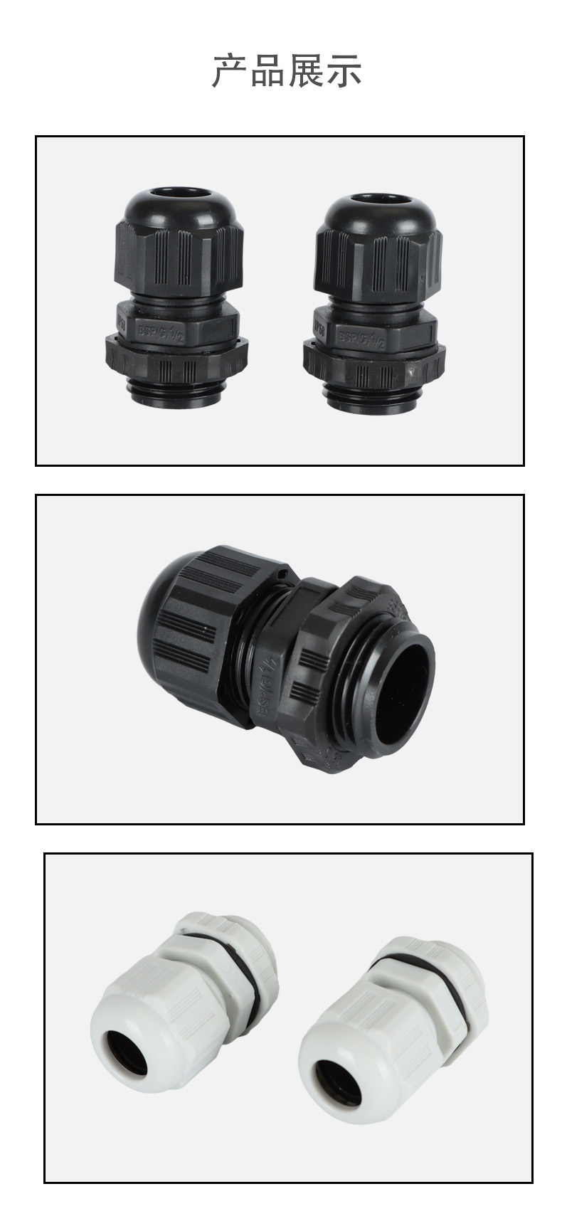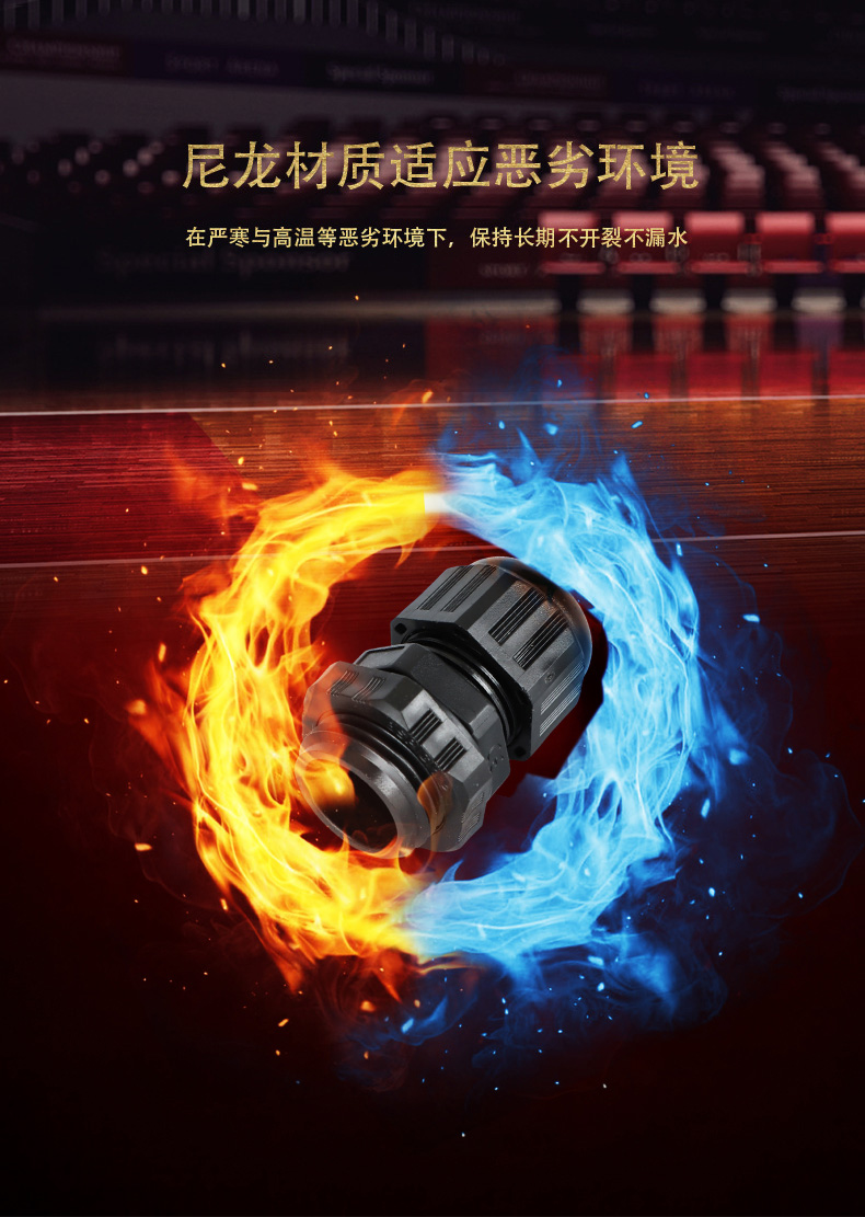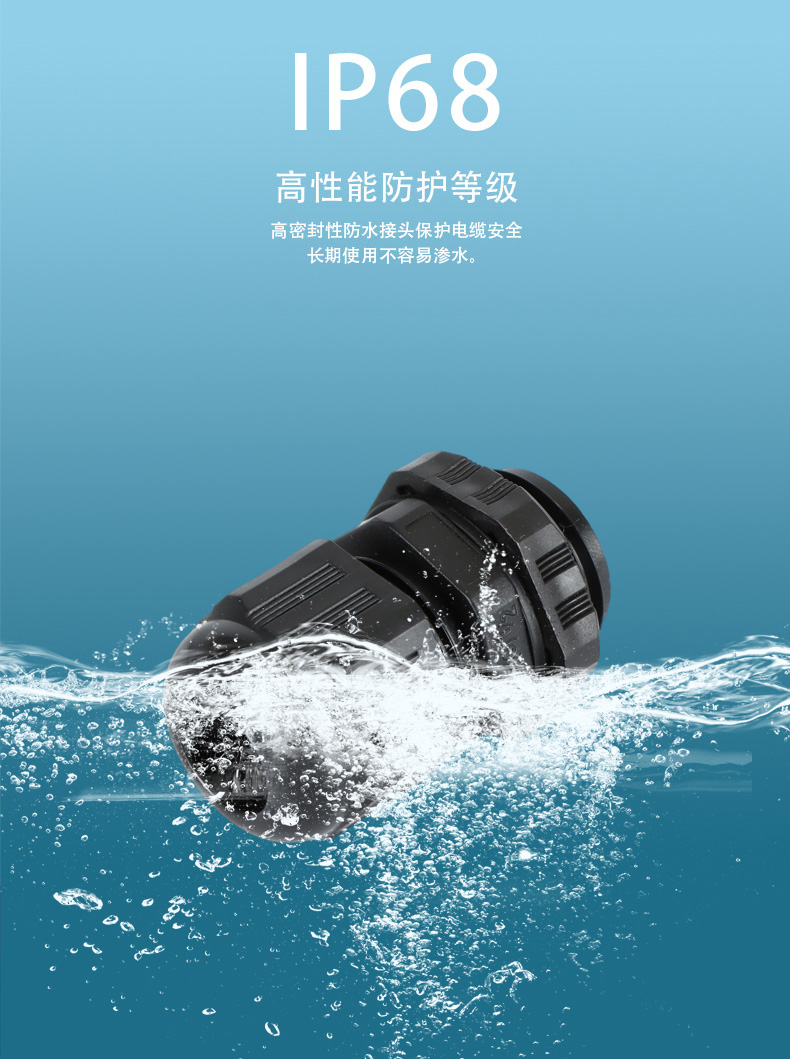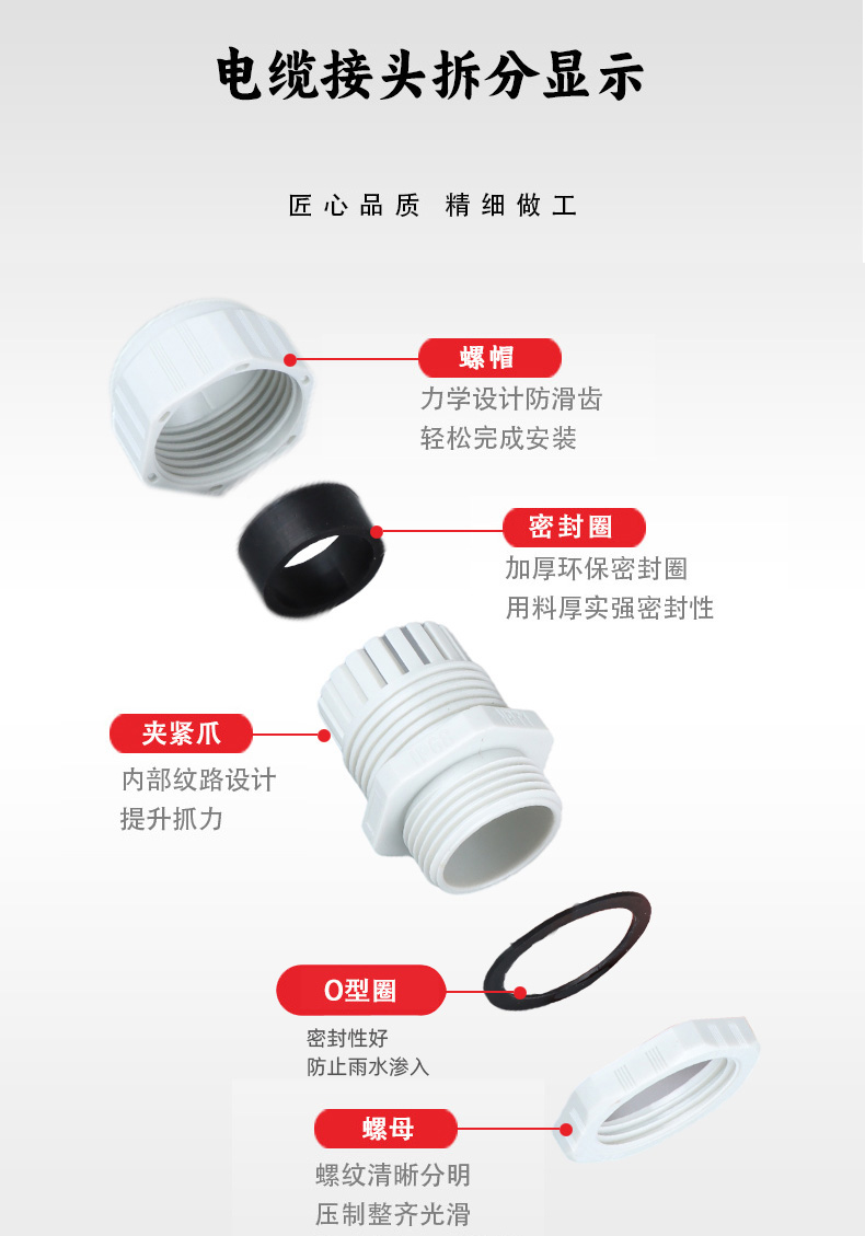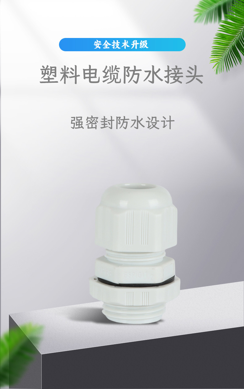 尼龍材質適用惡劣環(huán)境紅、灰、黑、深灰、白、藍 六種顏色常規(guī):黑、灰兩種顏色,其它顏色需要定做在嚴寒與高溫等惡劣環(huán)境下,保持長期不開裂不漏水高密封性防水接頭保護電纜安全,長期使用不容易滲水