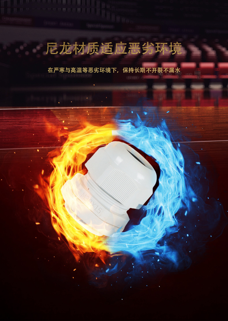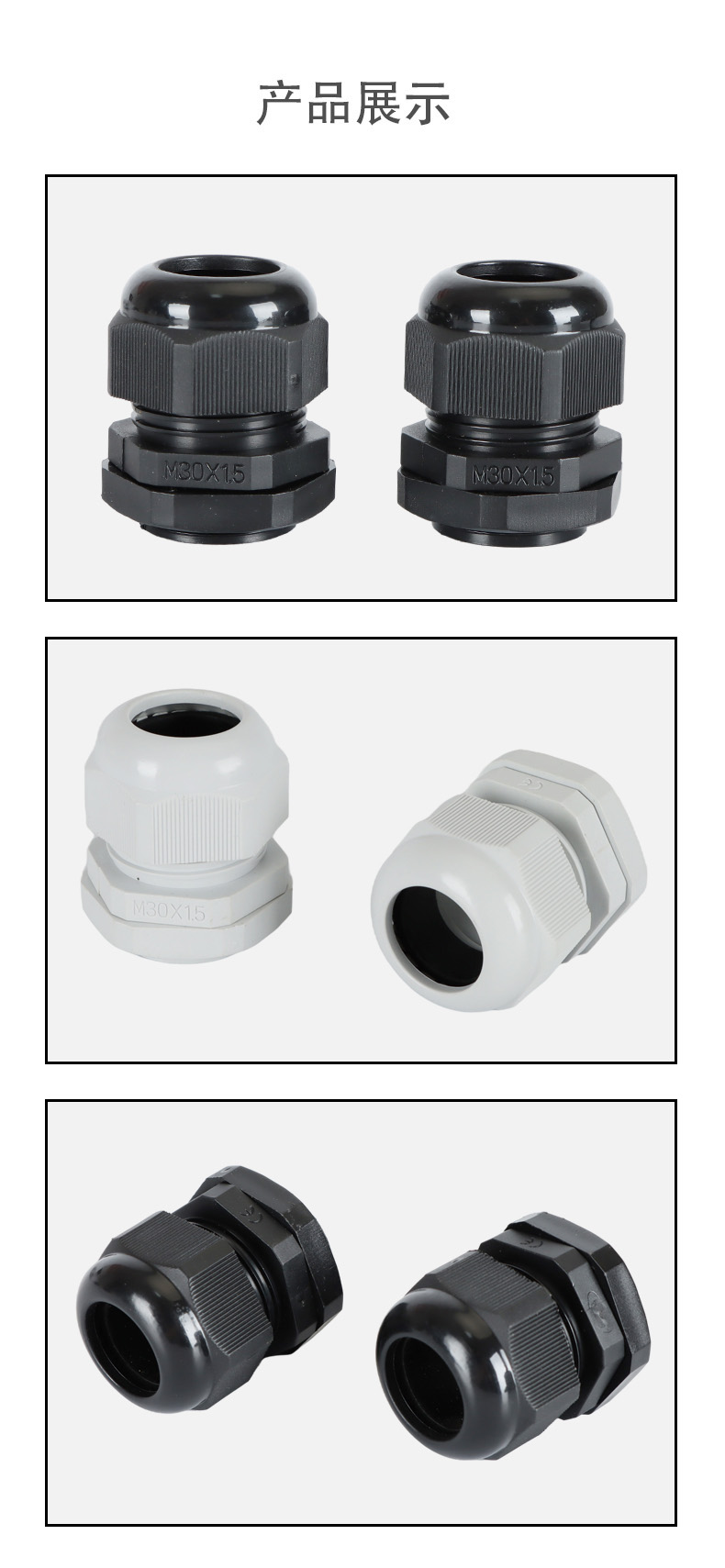 尼龍材質(zhì)適用惡劣環(huán)境紅、灰、黑、深灰、白、藍 六種顏色常規(guī):黑、灰兩種顏色,其它顏色需要定做在嚴寒與高溫等惡劣環(huán)境下,保持長期不開裂不漏水高密封性防水接頭保護電纜安全,長期使用不容易滲水