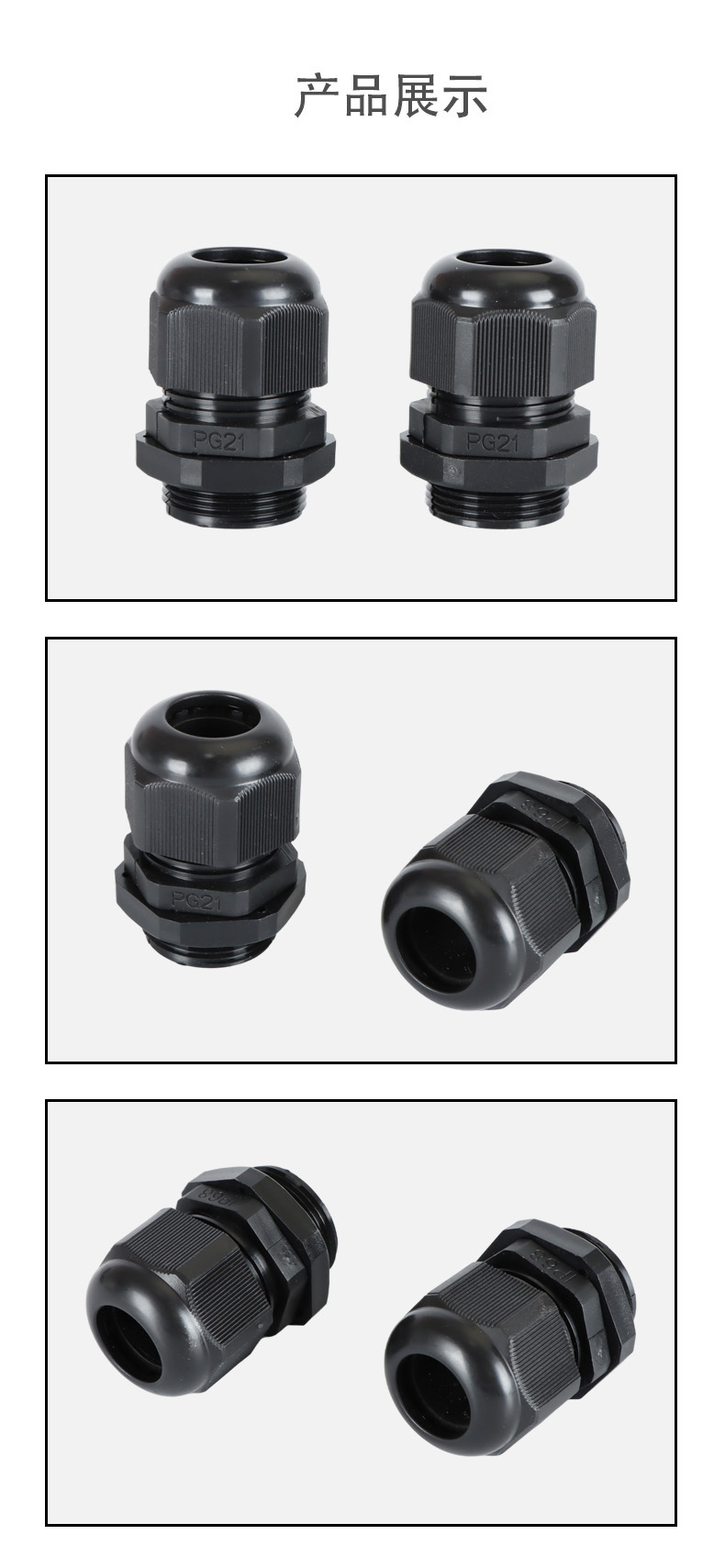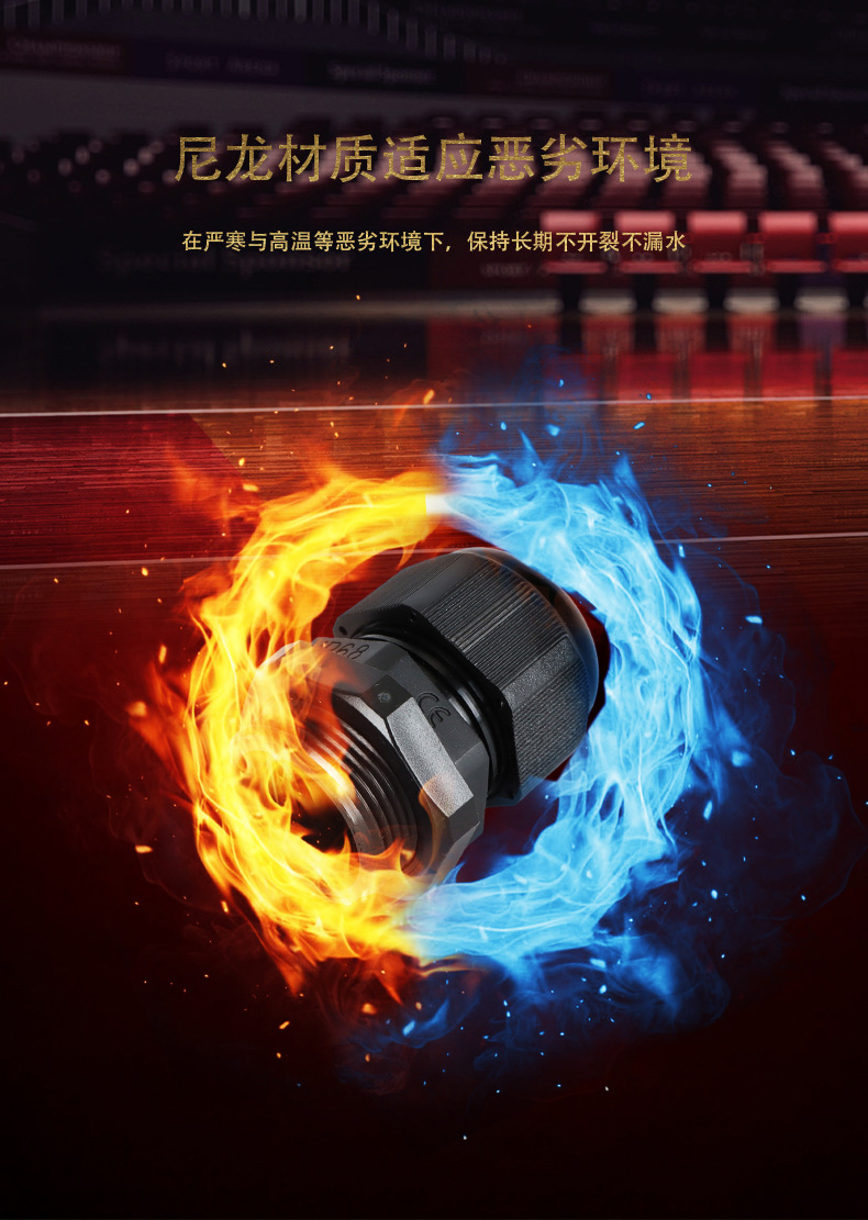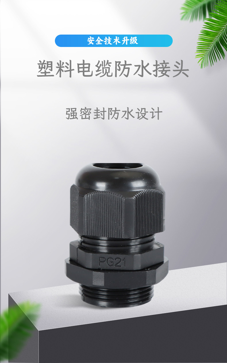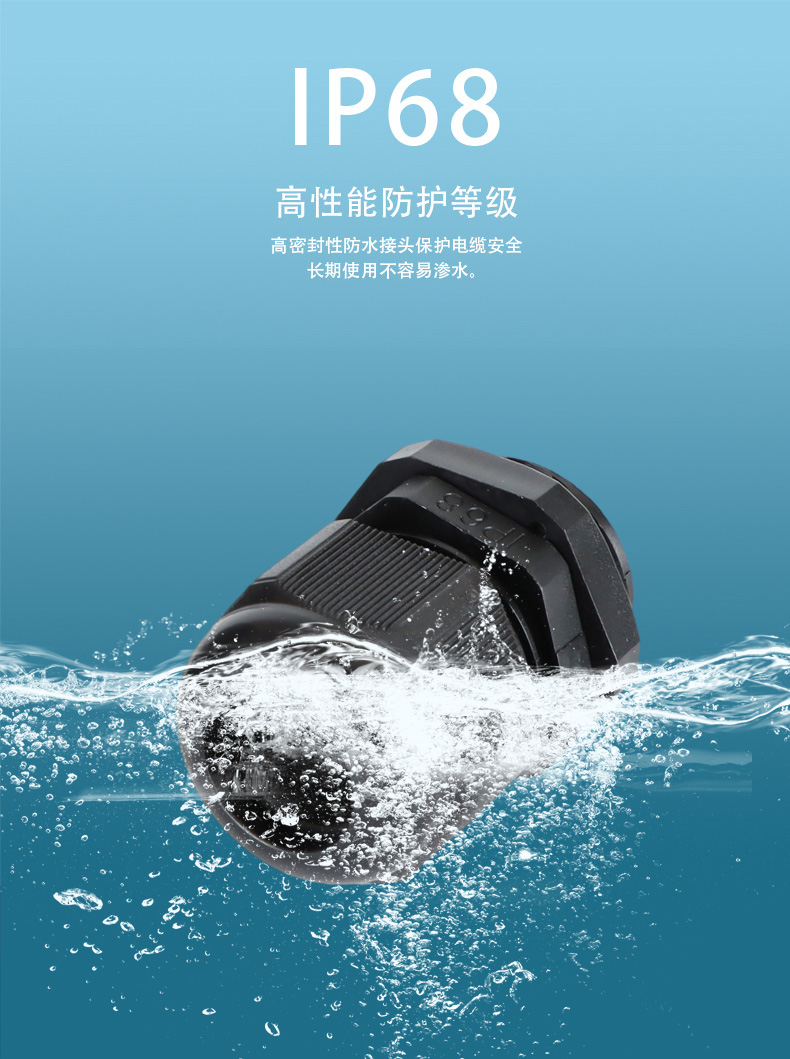 尼龍材質(zhì)適用惡劣環(huán)境紅、灰、黑、深灰、白、藍 六種顏色常規(guī):黑、灰兩種顏色,其它顏色需要定做在嚴寒與高溫等惡劣環(huán)境下,保持長期不開裂不漏水高密封性防水接頭保護電纜安全,長期使用不容易滲水