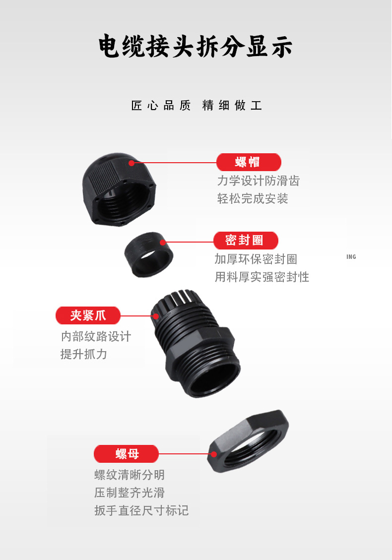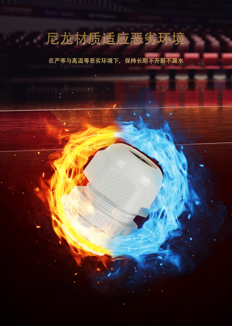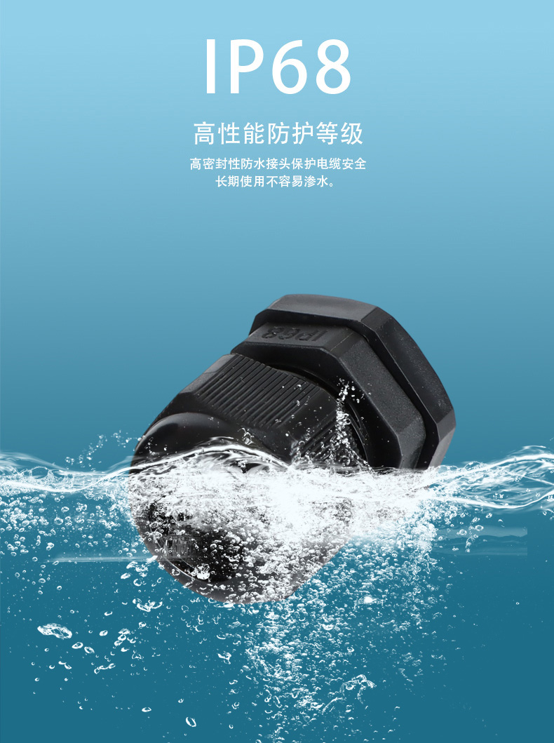 尼龍材質(zhì)適用惡劣環(huán)境紅、灰、黑、深灰、白、藍(lán) 六種顏色常規(guī):黑、灰兩種顏色,其它顏色需要定做在嚴(yán)寒與高溫等惡劣環(huán)境下,保持長(zhǎng)期不開(kāi)裂不漏水高密封性防水接頭保護(hù)電纜安全,長(zhǎng)期使用不容易滲水