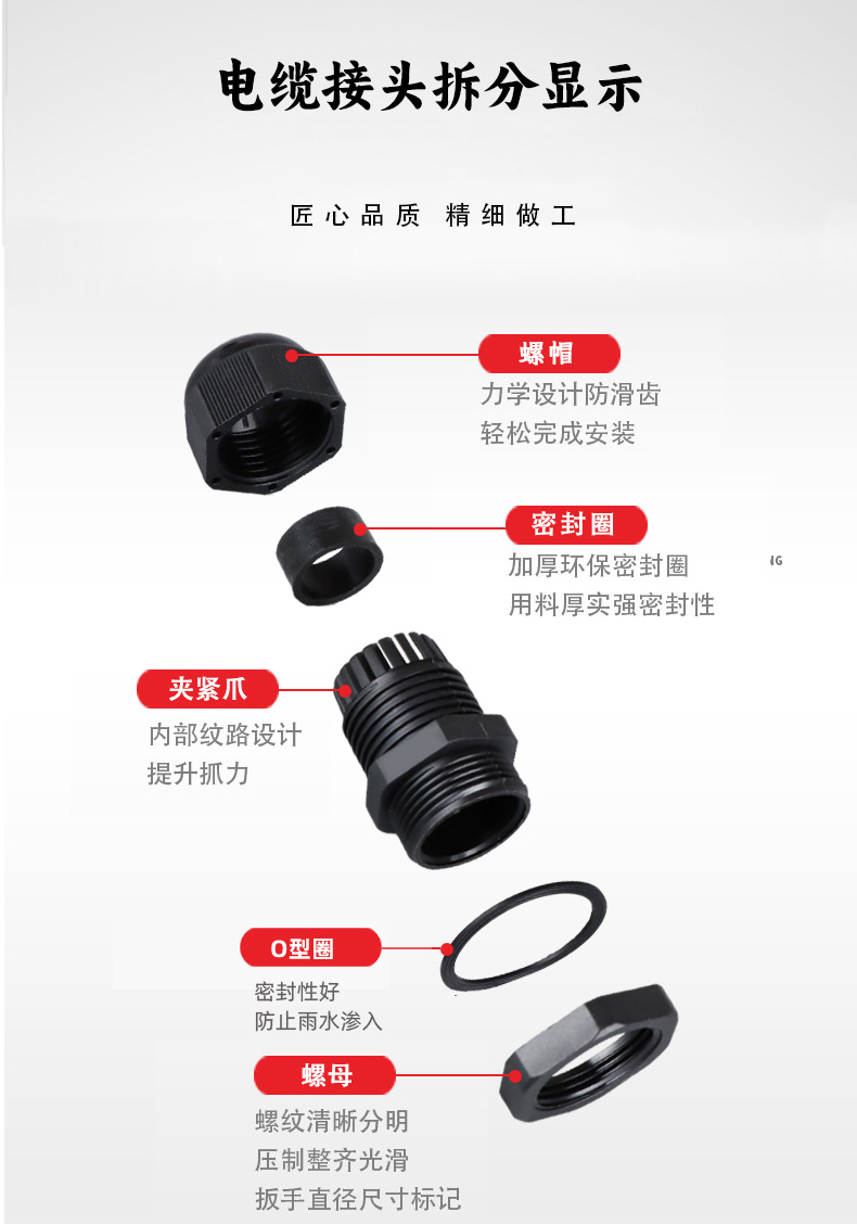 尼龍材質(zhì)適用惡劣環(huán)境紅、灰、黑、深灰、白、藍 六種顏色常規(guī):黑、灰兩種顏色,其它顏色需要定做在嚴寒與高溫等惡劣環(huán)境下,保持長期不開裂不漏水高密封性防水接頭保護電纜安全,長期使用不容易滲水