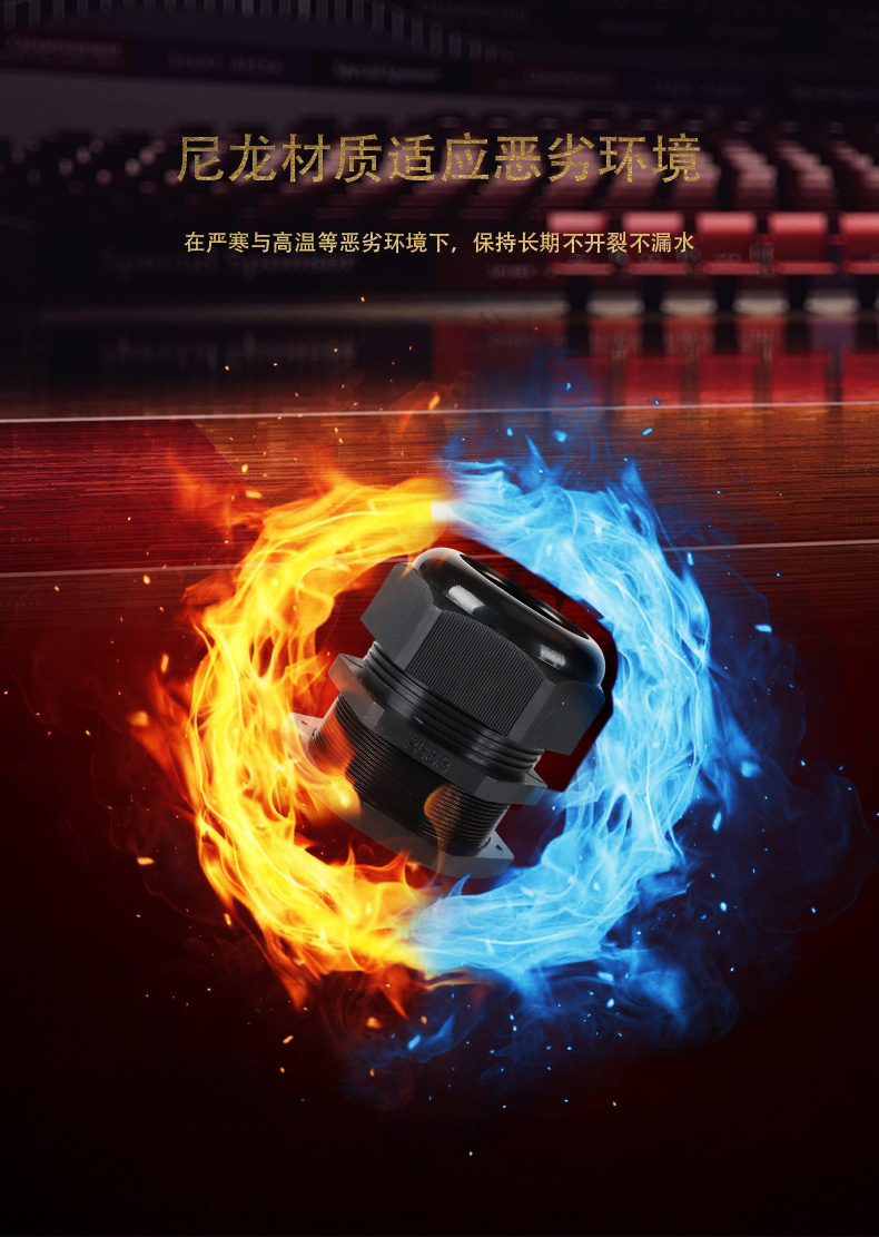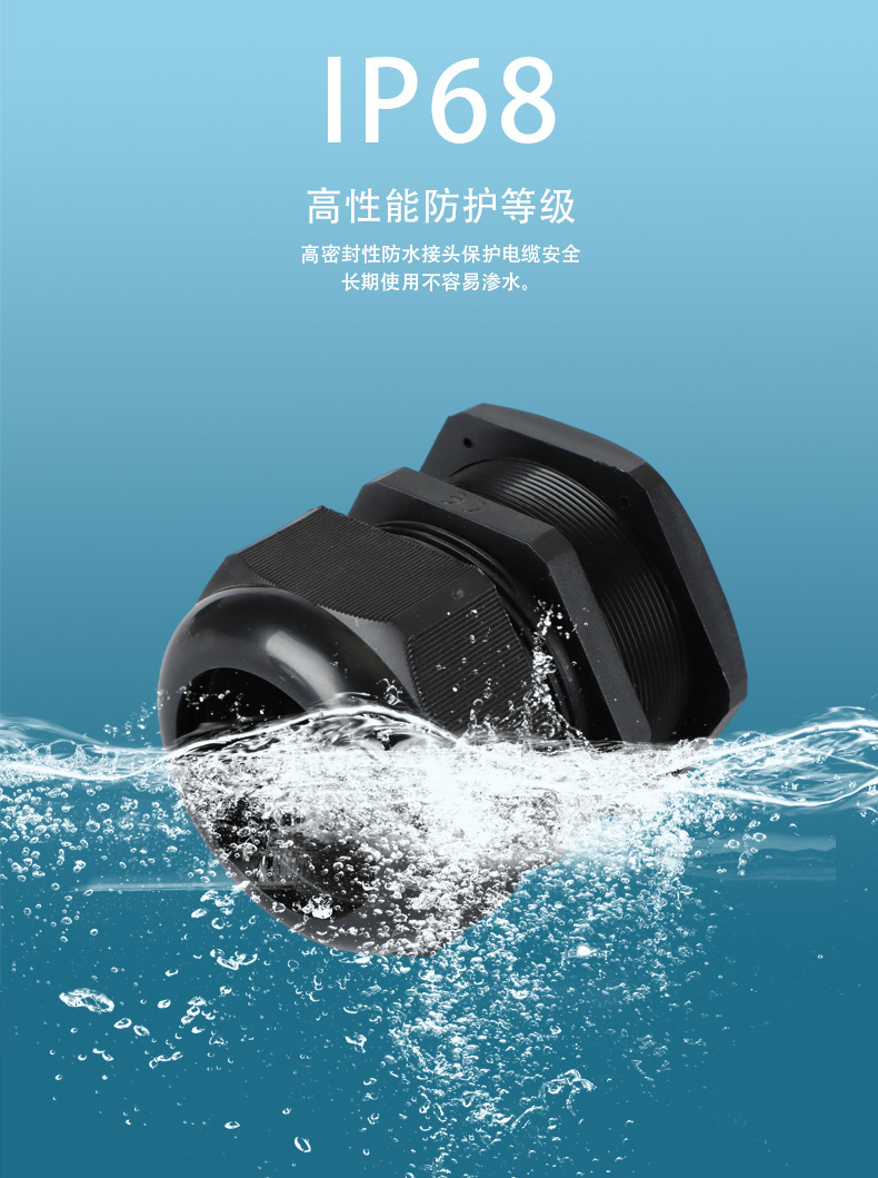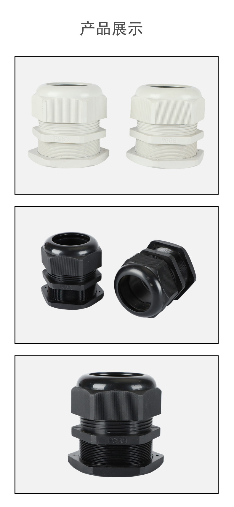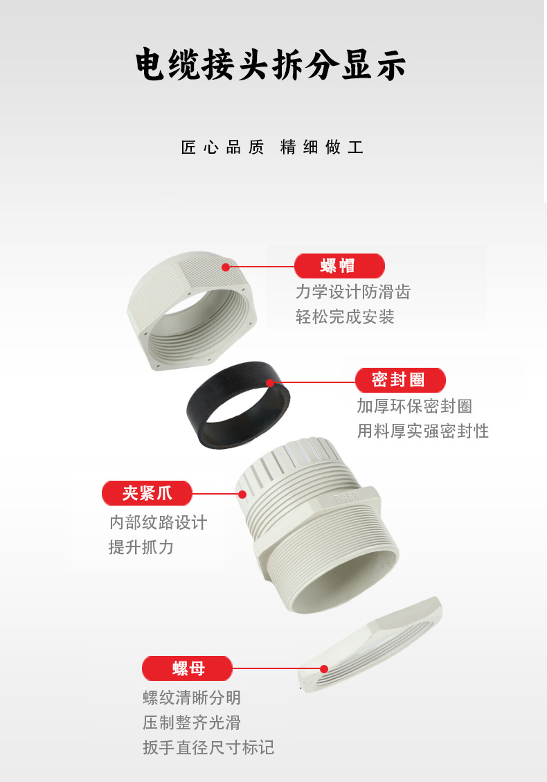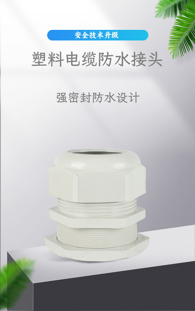 尼龍材質(zhì)適用惡劣環(huán)境紅、灰、黑、深灰、白、藍 六種顏色常規(guī):黑、灰兩種顏色,其它顏色需要定做在嚴寒與高溫等惡劣環(huán)境下,保持長期不開裂不漏水高密封性防水接頭保護電纜安全,長期使用不容易滲水
