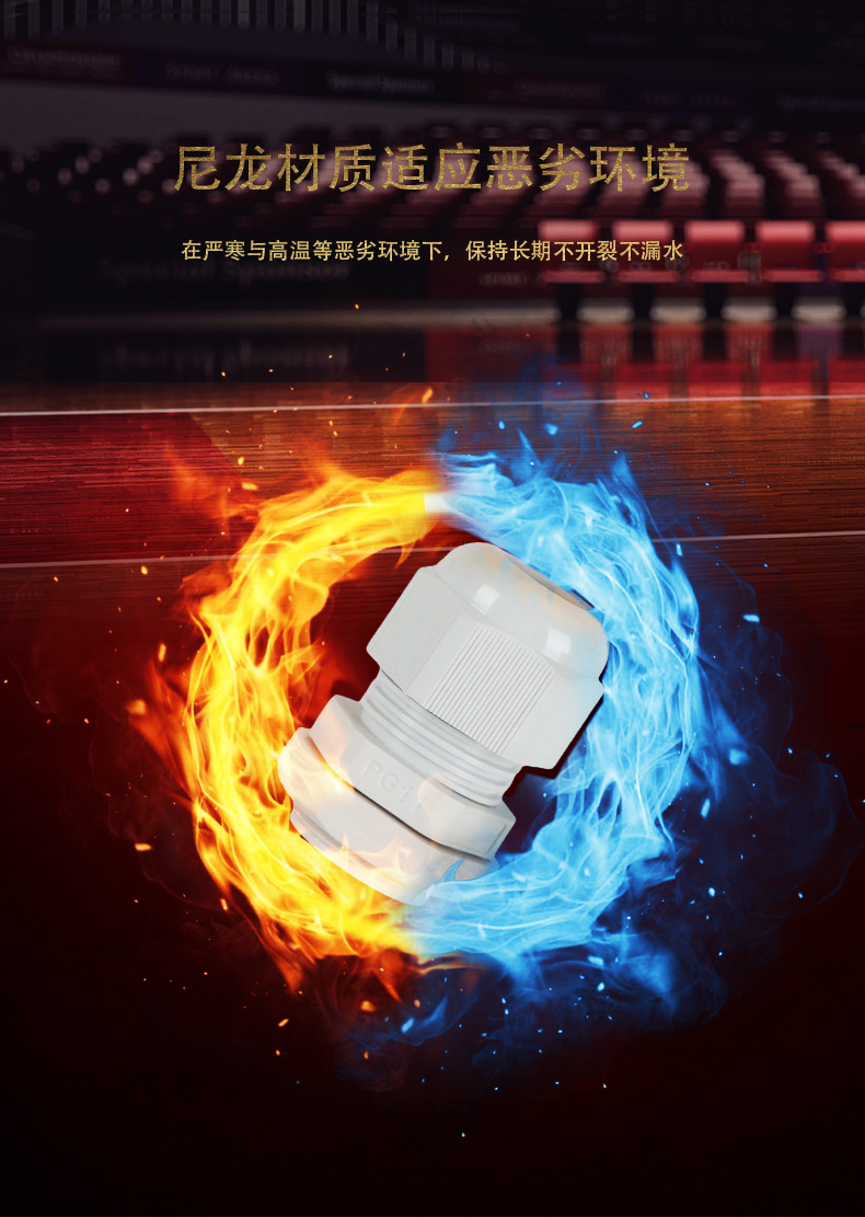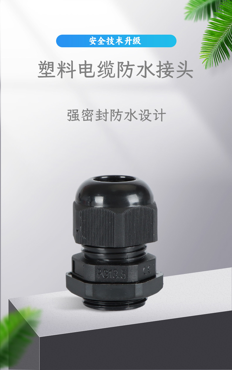 尼龍材質(zhì)適用惡劣環(huán)境紅、灰、黑、深灰、白、藍(lán) 六種顏色常規(guī):黑、灰兩種顏色,其它顏色需要定做在嚴(yán)寒與高溫等惡劣環(huán)境下,保持長期不開裂不漏水高密封性防水接頭保護(hù)電纜安全,長期使用不容易滲水