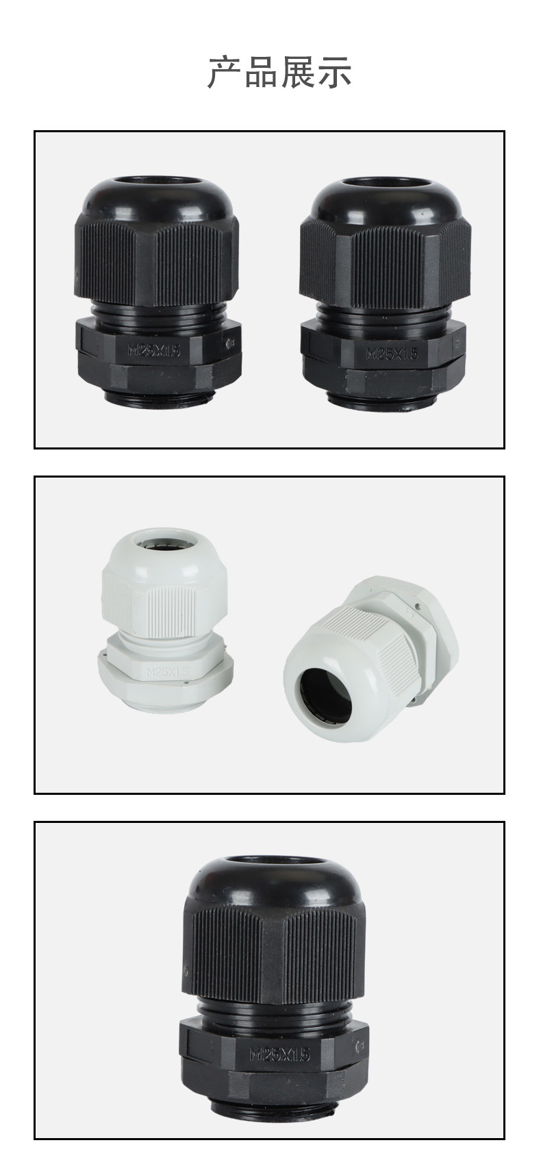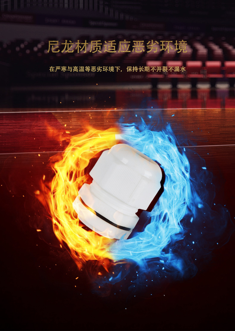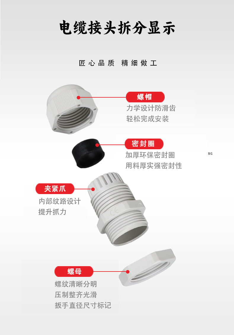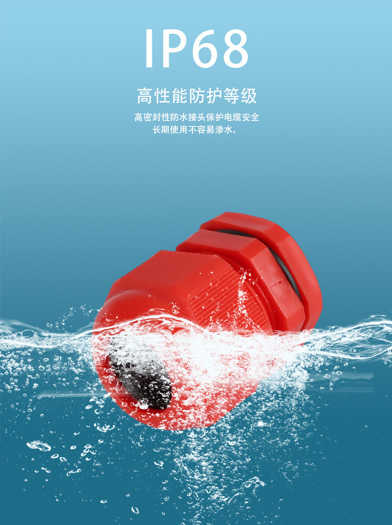 尼龍材質(zhì)適用惡劣環(huán)境紅、灰、黑、深灰、白、藍(lán) 六種顏色常規(guī):黑、灰兩種顏色,其它顏色需要定做在嚴(yán)寒與高溫等惡劣環(huán)境下,保持長期不開裂不漏水高密封性防水接頭保護(hù)電纜安全,長期使用不容易滲水