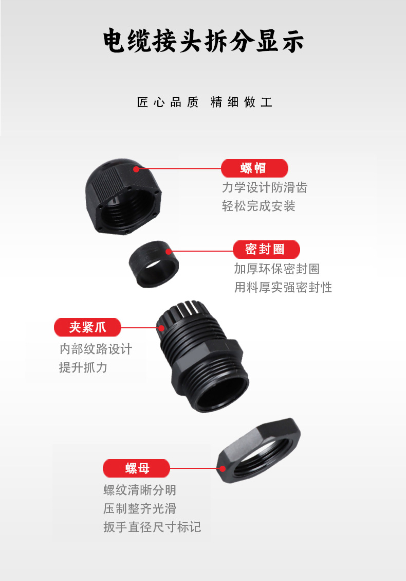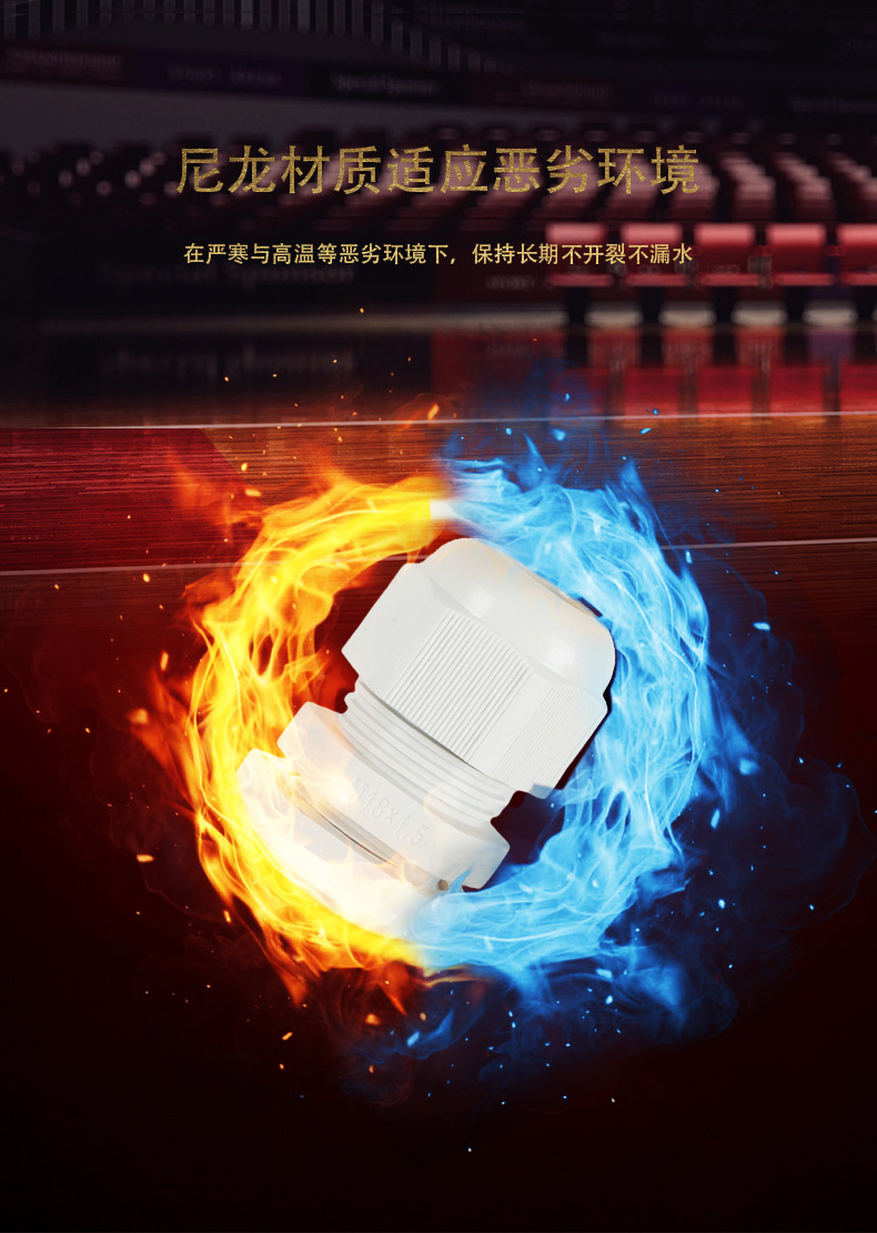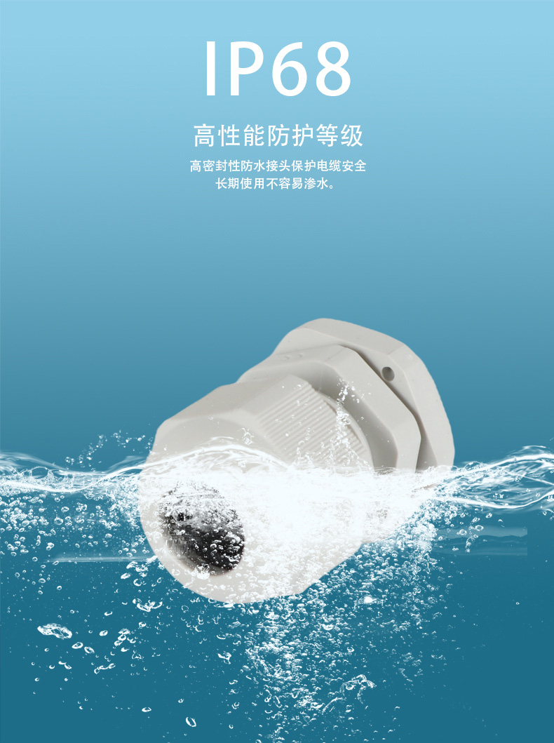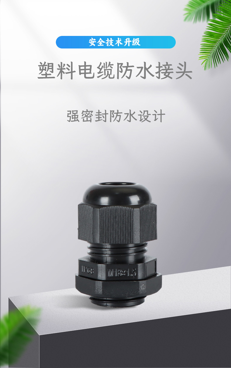 尼龍材質(zhì)適用惡劣環(huán)境紅、灰、黑、深灰、白、藍(lán) 六種顏色常規(guī):黑、灰兩種顏色,其它顏色需要定做在嚴(yán)寒與高溫等惡劣環(huán)境下,保持長期不開裂不漏水高密封性防水接頭保護(hù)電纜安全,長期使用不容易滲水