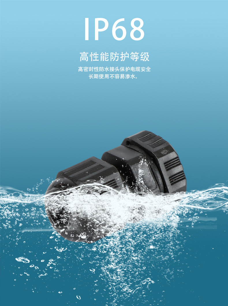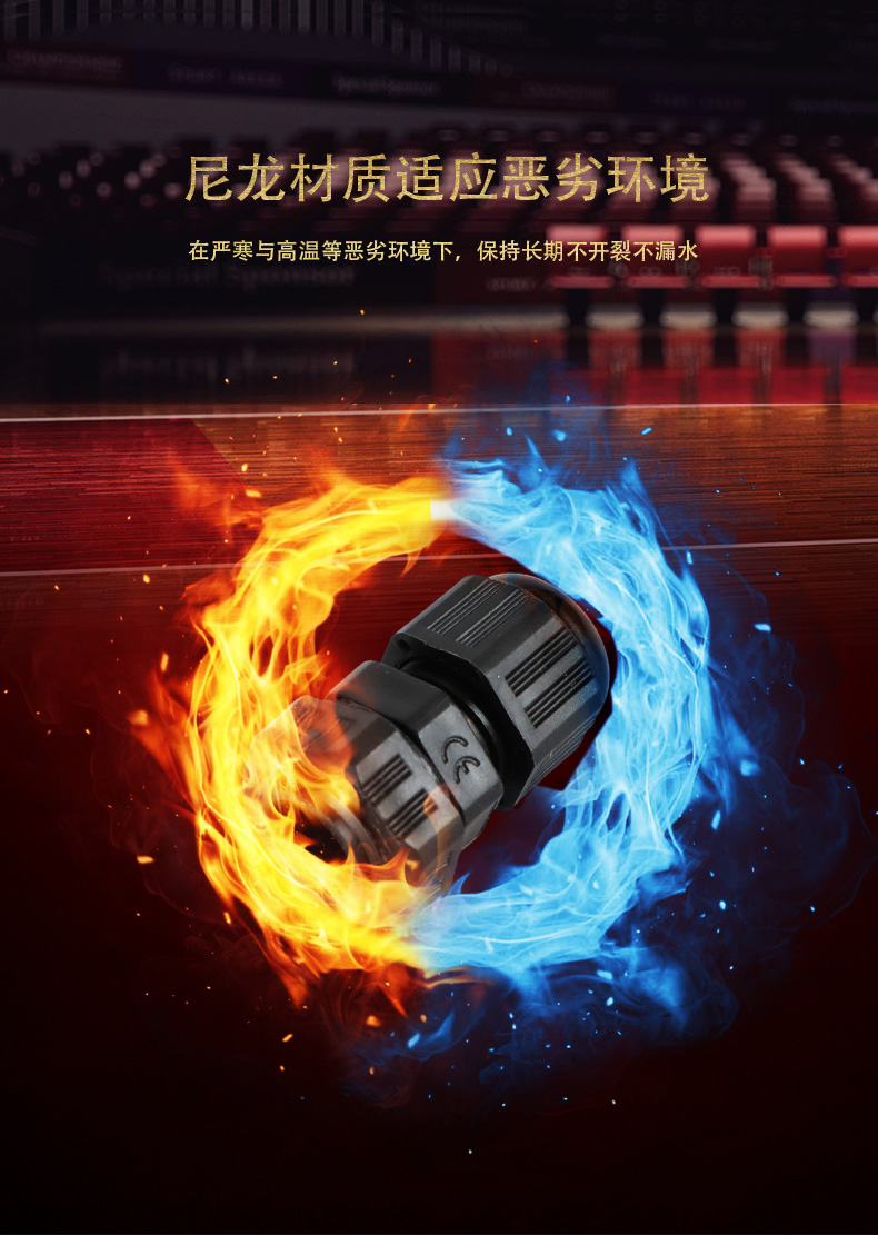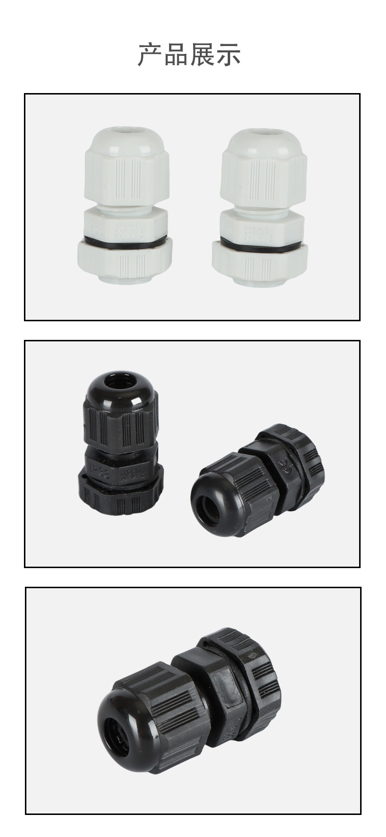 尼龍材質(zhì)適用惡劣環(huán)境紅、灰、黑、深灰、白、藍 六種顏色常規(guī):黑、灰兩種顏色,其它顏色需要定做在嚴寒與高溫等惡劣環(huán)境下,保持長期不開裂不漏水高密封性防水接頭保護電纜安全,長期使用不容易滲水